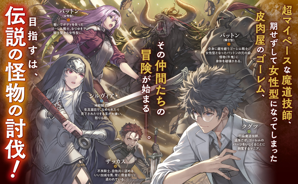 ゴーレムの人格に男女の違いはない。かわいいでしょ?――なりゆきでマスターのクグツにボディを女性型にされてしまった騎士型ゴーレムのパットンはそこで気が付いた。「これは戦略じゃない、単なるマスターの趣味だ……」魔道技師の青年が、伝説の怪物・ギガントノタウロスを倒すため、最強めざし相棒・パットンの女性型ボディを強く可愛く、趣味全開でコツコツ強化。お気楽主人と皮肉屋の相棒がウィットに富んだ掛け合いで贈る、最強バディ育成バトル・ファンタジー!