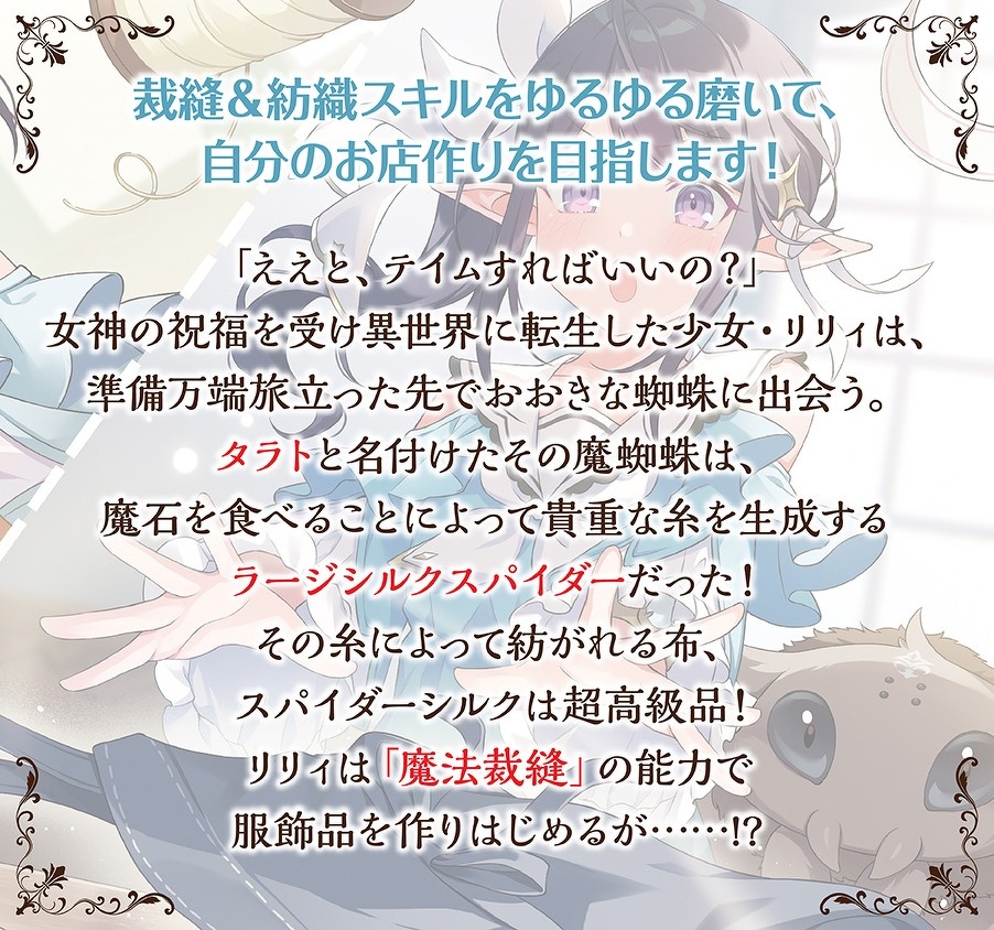 VRMMORPG好きの女子高生・笹木百合は、不幸にも病死してしまうが、女神からの祝福のもと異世界によみがえった。そこで示されたのは、裁縫にまつわる技術を使って生きていくか、再び輪廻の輪に戻るかという二択の生きる道。せっかく新しい人生が与えられたなら楽しまなくちゃ損だよね……ということで、女神に与えられた小屋で武器や魔法の扱い方を覚えた少女・百合改めリリィは、特大の登山用リュックを背に人里を目指すのだった。そして大蜘蛛のモンスター、タラトを仲間に迎え、蜘蛛糸を採取できるようになったリリィは、タラトがはき出す最高品質のスパイダーシルクから作り出した日用品を売って生計を立てていこうと決心する――様々な人々のお世話になりながら、自分のお店の開店を目指す少女が、ポジティブに頑張るファンタジー!
